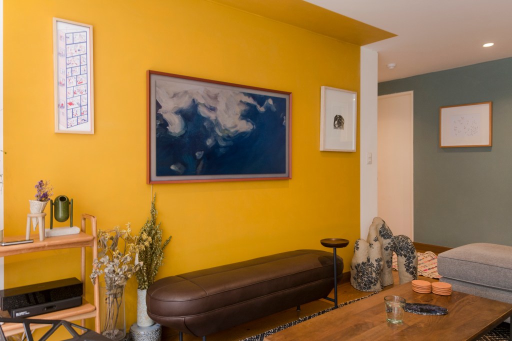 La cocina se fusiona con la sala, que está decorada con un cuadro pintado por la propia Kiara y una pared amarilla que le da vida. Y hay más colores. La pared de ingreso la pintaron de verde ellos mismos, pese a que no sabían muy bien cómo hacerlo. “Pensé que era como el óleo y le puse demasiada agua a la pintura”, recuerda Kiara entre risas. “Cuando veo fotos del depa con las paredes blancas no lo puedo creer”.