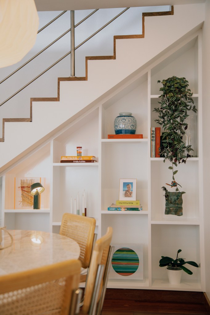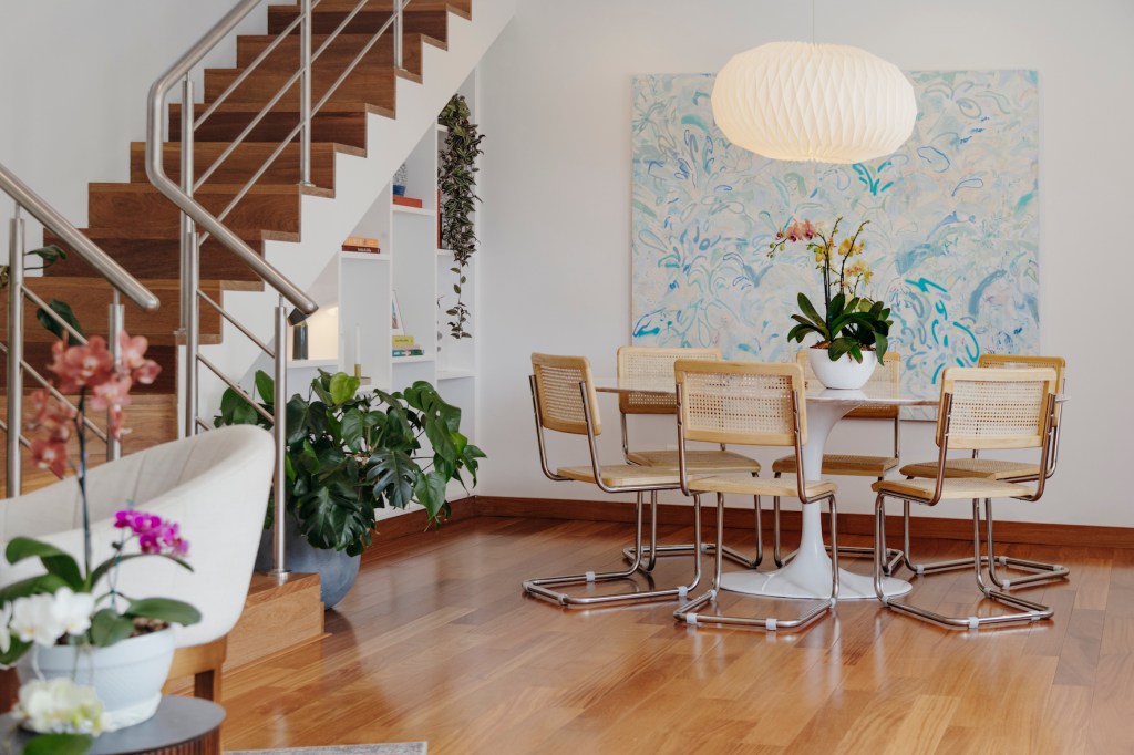 En el comedor, un óleo en gran formato de Alejandra Pérez da un fondo de color al ambiente y conecta con el espacio social. La parte baja de las escaleras se aprovechó muy bien con una serie de repisas para libros, objetos y plantas. Abundan las orquídeas, una flor que demanda paciencia, amor y un cuidado particular. Nicole heredó el gusto por ellas de su papá. En este momento de su vida, son un recordatorio de lo importante que es avanzar sin prisa.