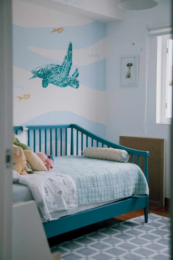 Y luego está la habitación de su hijo, con unas gigantes tortugas marinas pintadas en la pared, invitando a viajar entre peces dorados y olas. El librero lo mandó a hacer, así como la cama. A pesar de que no faltan los tonos vibrantes en este cuarto (especialmente el rojo, que es de Spiderman, uno de los personajes favoritos del pequeño), Nicole también quería que se contagie de la misma paz que visualizó para el resto de la casa.