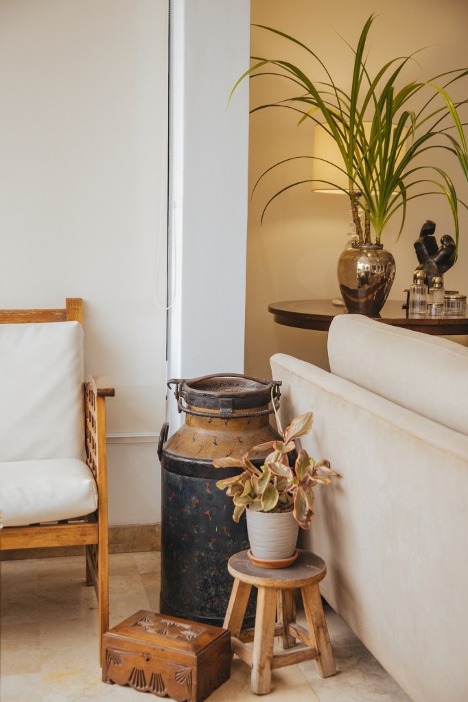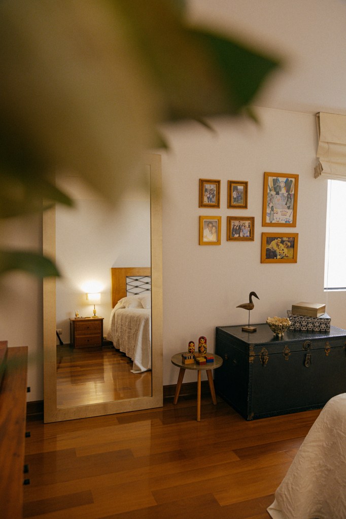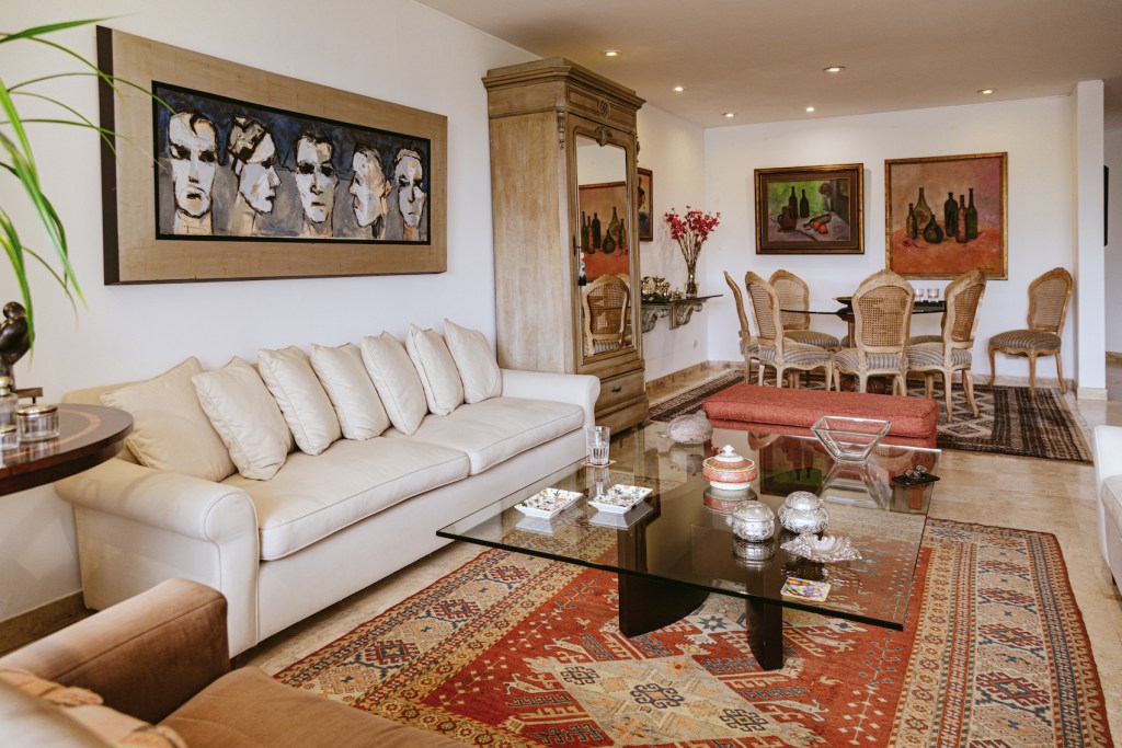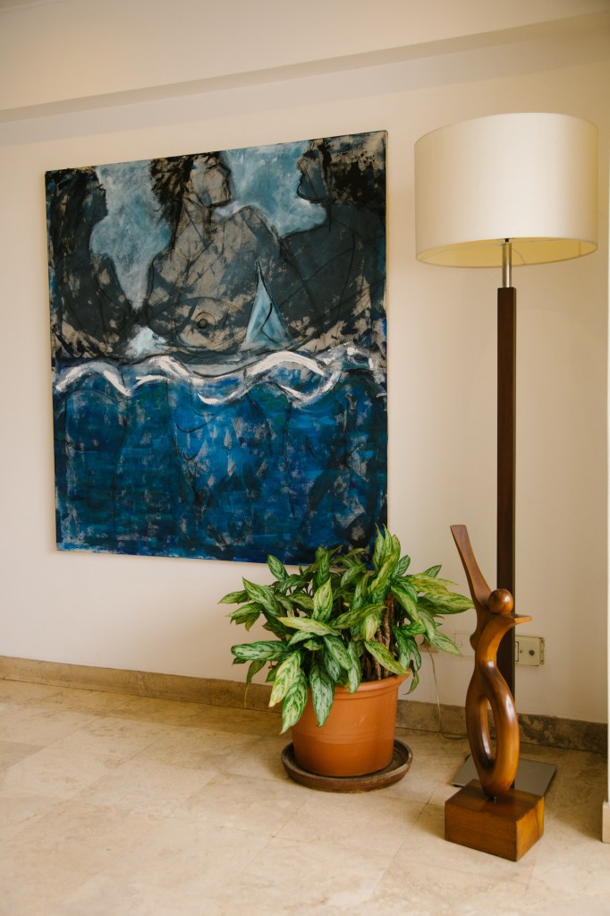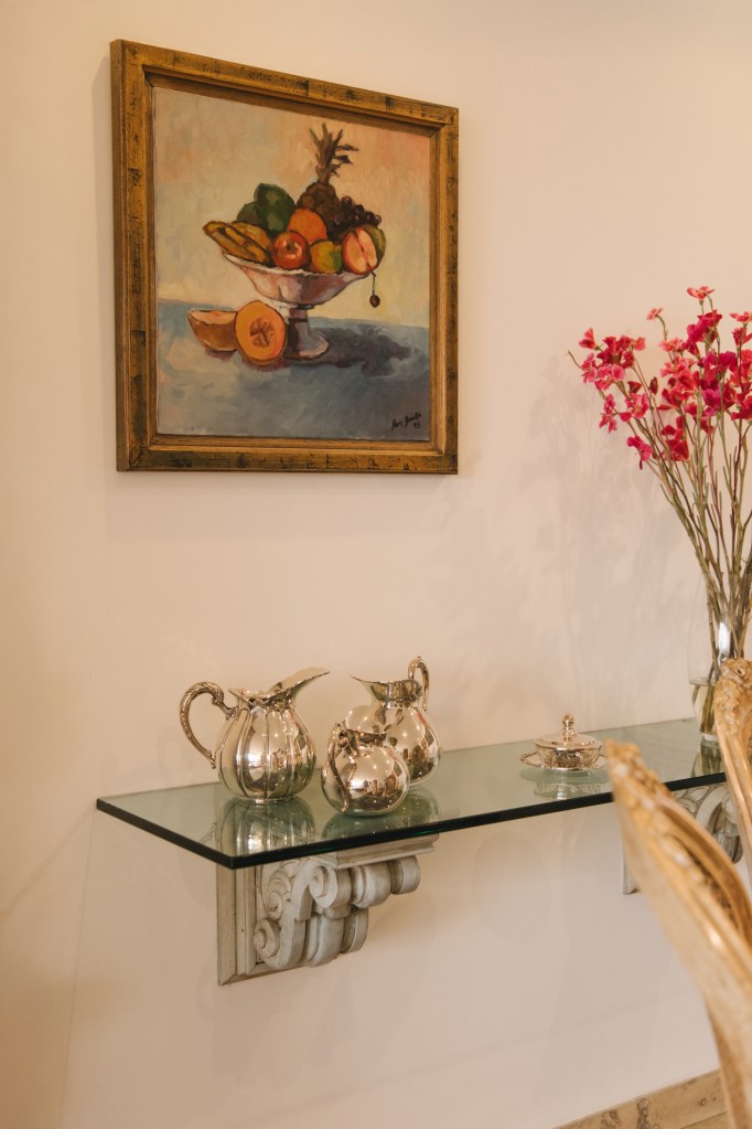 Las paredes ya no son cremas, sino blancas y las pinturas de José Luis las habitan con una especie de seducción; no imponen, pero llaman a la contemplación. Los muebles son reliquias de la familia, especialmente el bar que perteneció al tatarabuelo de Genoveva y que, durante los noventa, fue utilizado como alacena en un cuarto oscuro. Por fin ha recuperado el lugar importante que siempre debió tener.