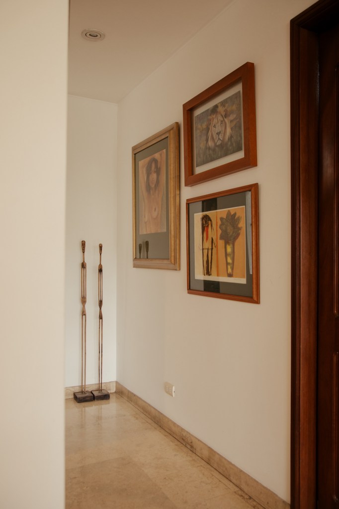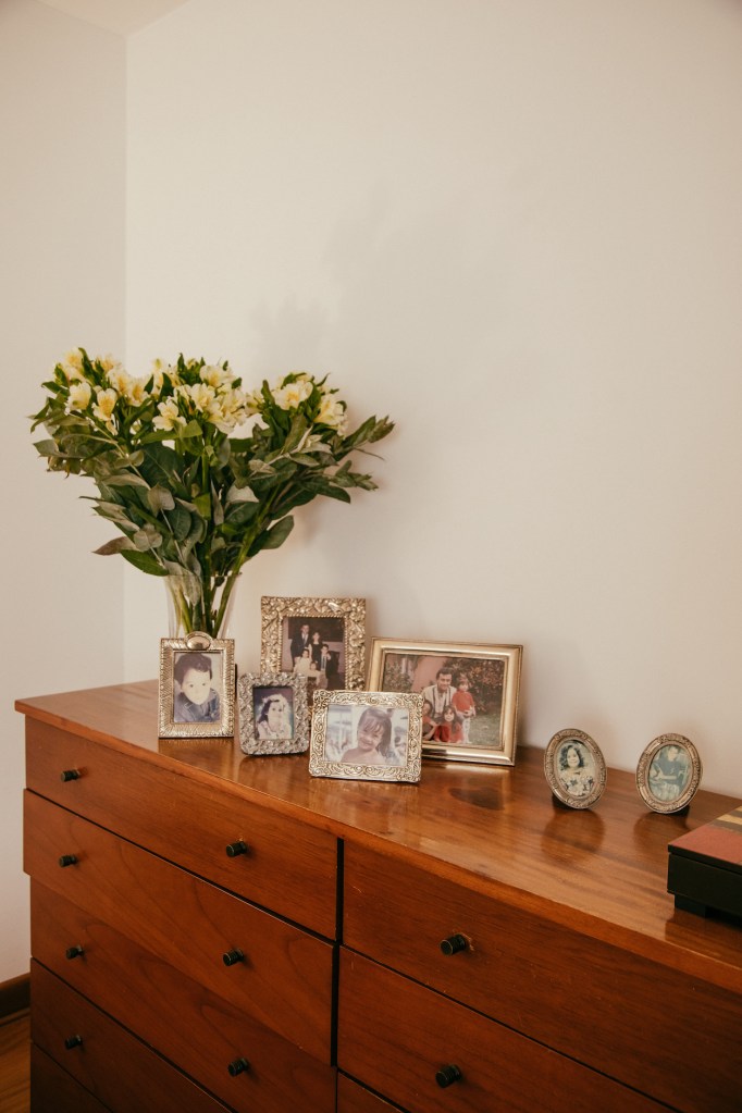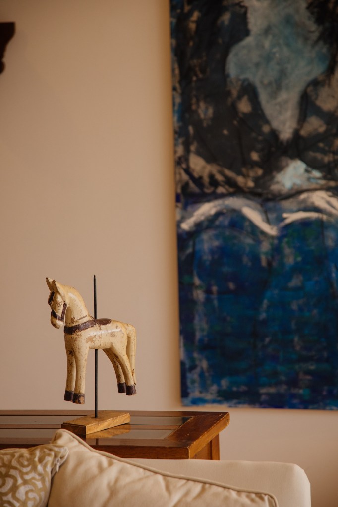 Todo el que haya pasado por una mudanza sabe que seleccionar qué llega a la nueva casa y qué debe quedarse en el camino es siempre retador. “Es sorprendente darse cuenta de la cantidad de cosas que uno guarda porque sí”, confiesa José Luis. En la sala de estar, hay objetos preciados, como las figuras de cerámica hechas por sus hijos cuando eran pequeños, una escultura y un dibujo, también hechos por sus hijos ya más grandes; algunas cositas que sus abuelos guardaron y les dieron un valor sentimental, como una cámara; los libros de fotografía de José Luis y, por supuesto, sus pinturas, como los bodegones del comedor (que son de los primeros óleos que pintó) y los rostros que adornan la sala.