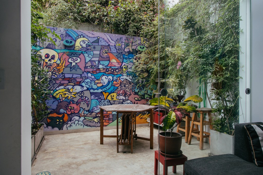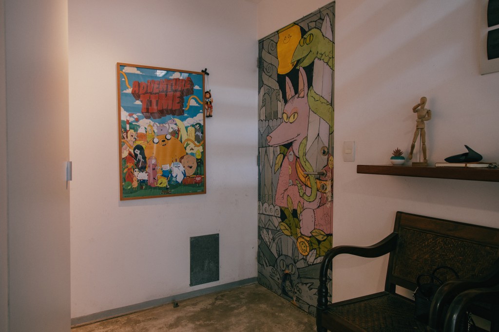 Lo primero que hizo fue encargarle un mural a su amigo, el artista urbano Seimiek, para la pared de su patio. Es un remate visual que da vida al depa y que lo mantiene constantemente entusiasmado. Seimiek incorporó referencias, como la montaña de “La historia sin fin”, una de las películas favoritas de Sandro. El artista también intervino la puerta principal del depa en homenaje a Uma, la perrita peruana que acompañó a Sandro durante siete años, justo donde está el hueco que ella hizo alguna vez y que él nunca quiso arreglar por cariño.
