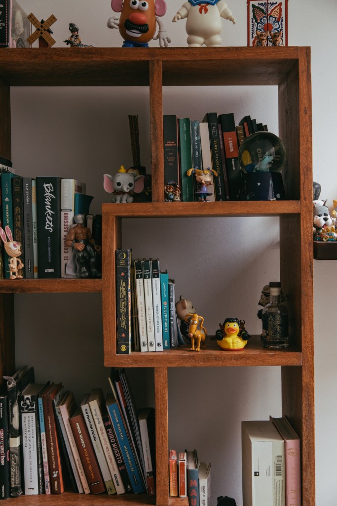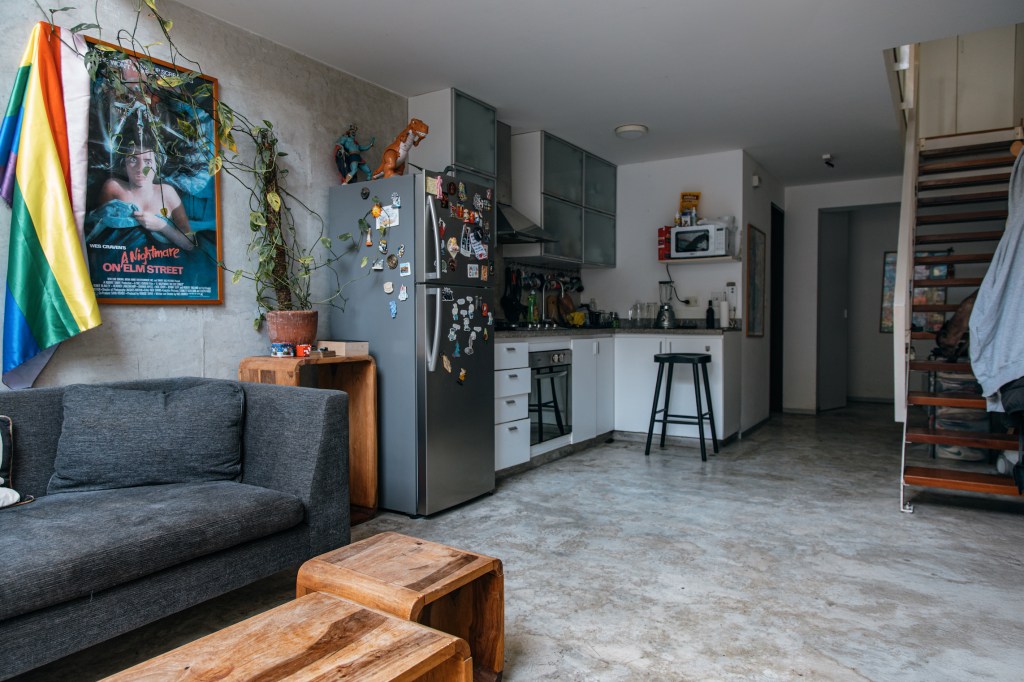 El loft tiene un diseño de planta abierta, que incorpora la entrada, la cocina, la sala y el patio. En esa zona social se lucen los posters de sus cintas preferidas, como “The Goonies” y “A Nightmare on Elm Street”, que trajo desde España y Francia; y un librero de madera, que mandó a hacer con un carpintero y está lleno de novelas gráficas, libros peculiares y juguetes, que son su gran colección. Los tiene en varios lugares, como en la cocina donde, por cierto, también tiene una serie de tazas curiosas.