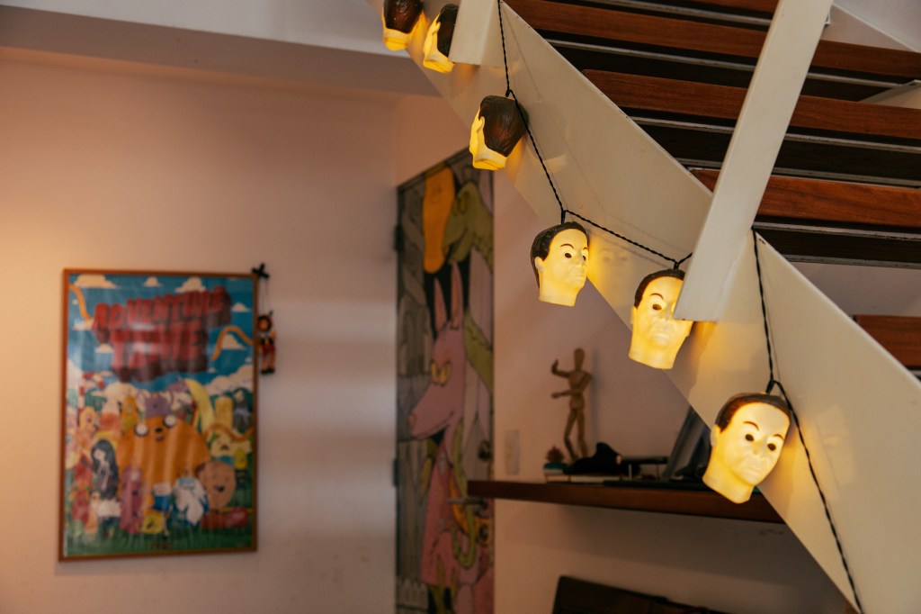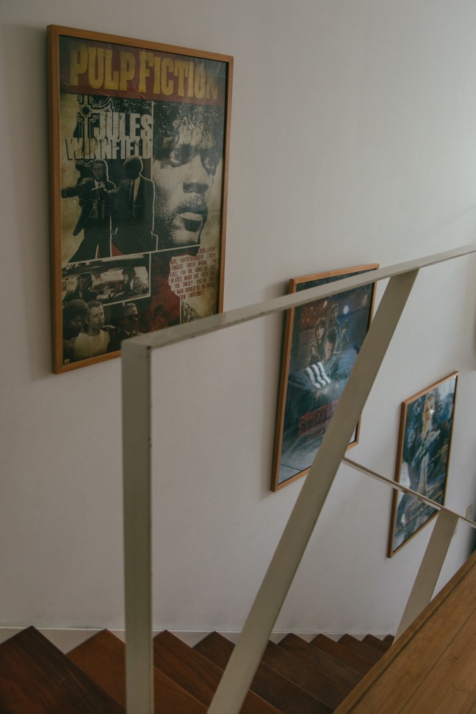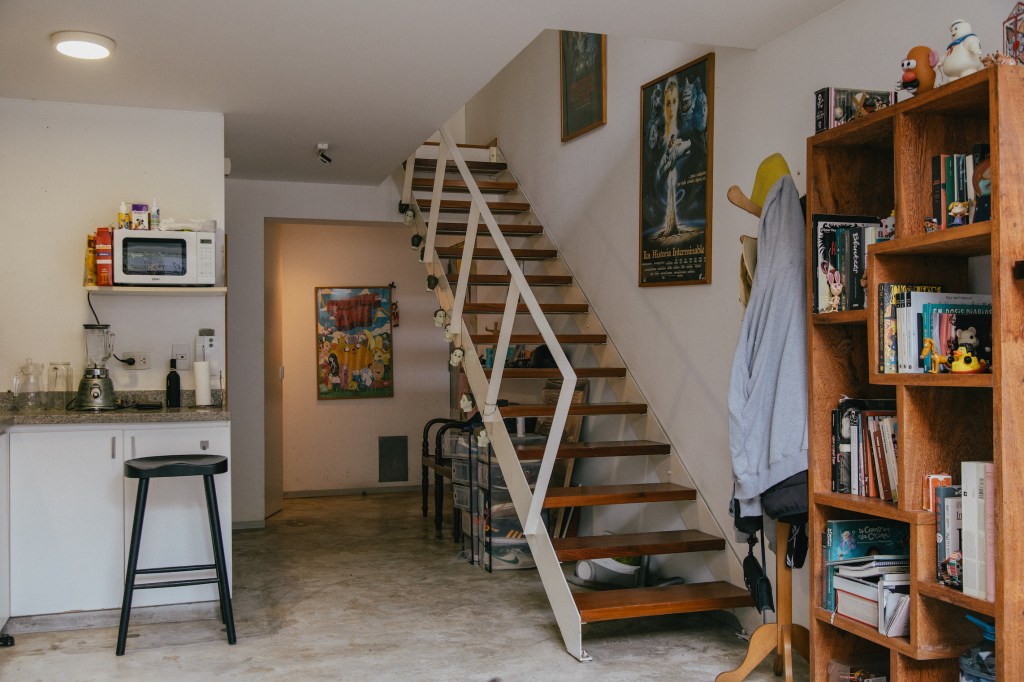 Las escaleras, adornadas con más posters, llevan al dormitorio del dúplex, donde Sandro pasa buena parte de su día. Allí es donde se relaja y ve películas y series, y donde trabaja en su escritorio de madera con vista al patio. Lo inspira el muro verde que se va formando ahí afuera, con la madreselva que ya ha plantado gracias a la asesoría de su amigo, el paisajista Valerio Ávila. Ha decidido poner una hamaca en el patio, para aprovecharlo aún más.
