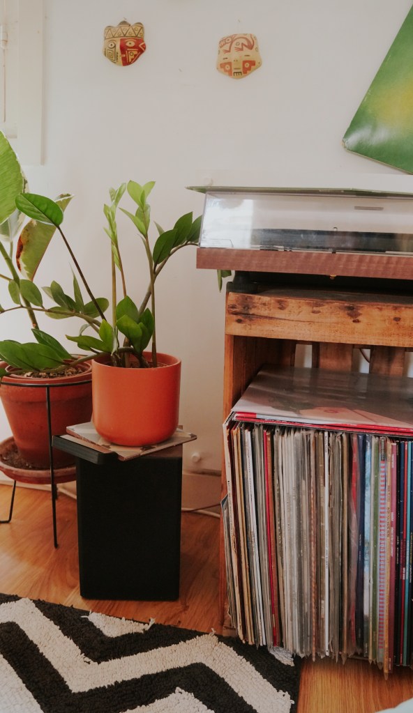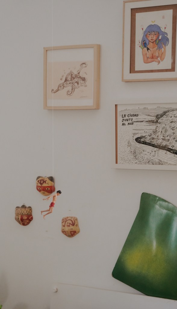 Tiene arte de las peruanas Lucía Coz, Manika Post y Fefa Cox. En la sala, el tocadiscos es una pieza importante, así como lo son sus plantas. En su dormitorio, la cabecera de la cama es el ladrillo rococho que le da calidez y textura a la habitación. En la pared tiene dos cuadritos de tapadas limeñas que una amiga le dejó encargados, y un retazo de tela que le regalaron y ella enmarcó. El tapete que le trajeron de México, y que sirve como camino de mesa, ella lo ha colgado en la puerta de su dormitorio. En su balcón solían haber muchas plantas, pero siempre se le morían por la luz directa. Ahora quedan algunas macetas vacías, y es el lugar donde su perrito Aurelio toma el sol. Su ventana queda justo sobre la calle, entre dos placitas típicas de Gracia.