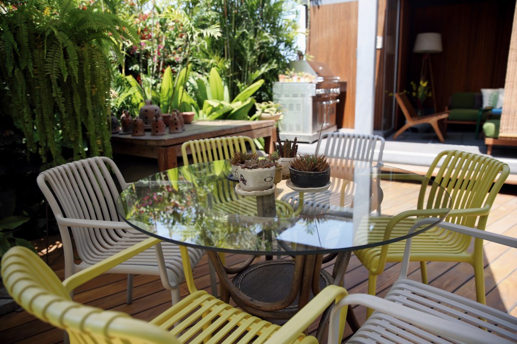 Indudablemente, el valor emocional juega un rol importantísimo en la disposición del mobiliario y la decoración de esta casa. Además de la parrilla, en el jardín hay una mesa que exhibe una colección de lamparines de barro hechos en Isla Margarita. Estas piezas de artesanía, típicas de la isla, fueron los principales elementos decorativos del día de su boda.
